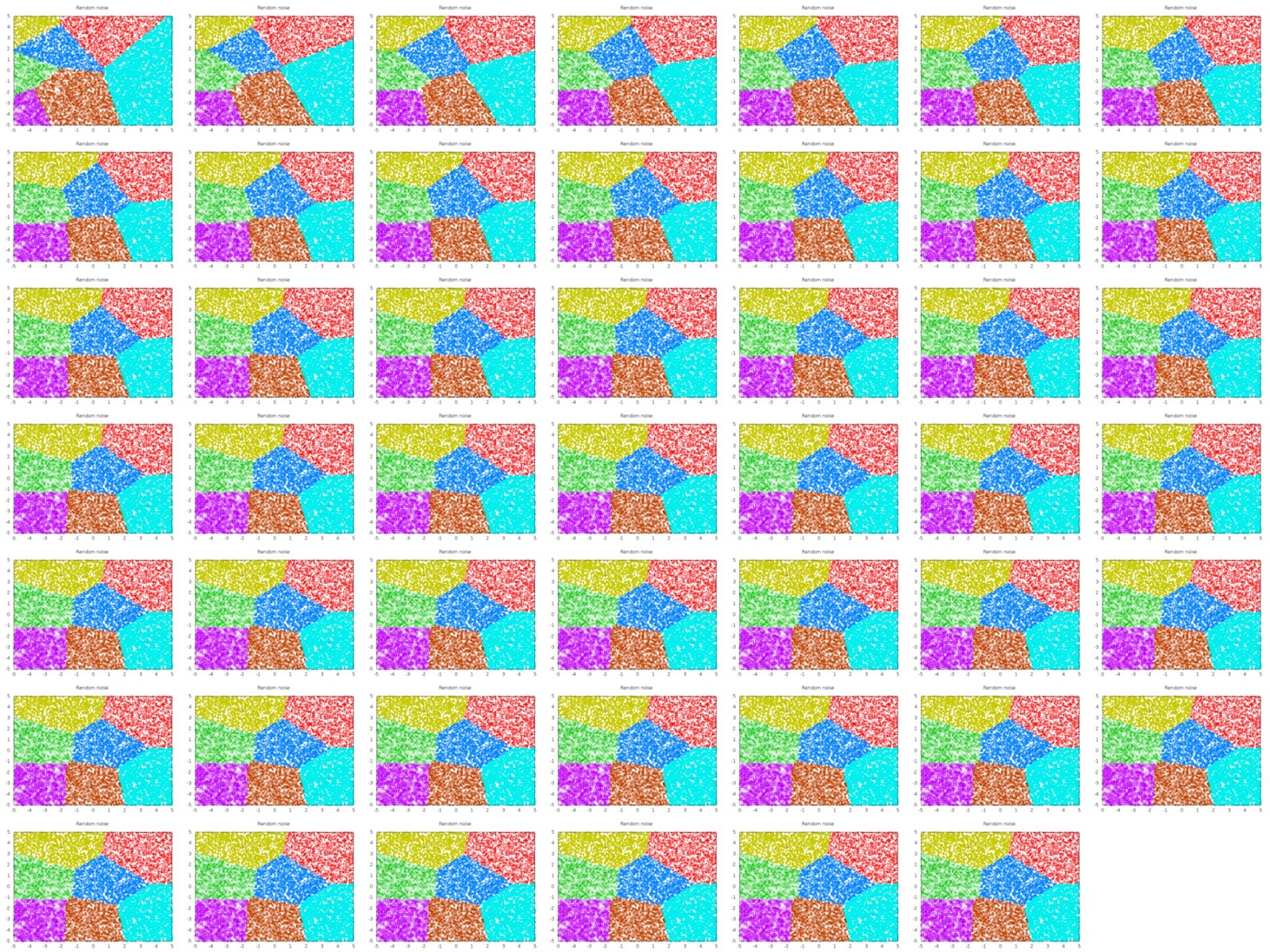 Then I created a very silly little script that generates 10000 random points in 2D and (tries to) put them into 7 clusters, gnuplot'ing each iteration, to test the algorithm.