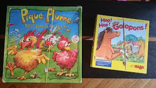 Pique-Plume is a game I've seen on many a list of recommendations for board games for kids. And since it has a kind of chicken-and-eggish theme, I figured it would be a perfect match for our Easter weekend. It is a really simple memory game with race mechanics.