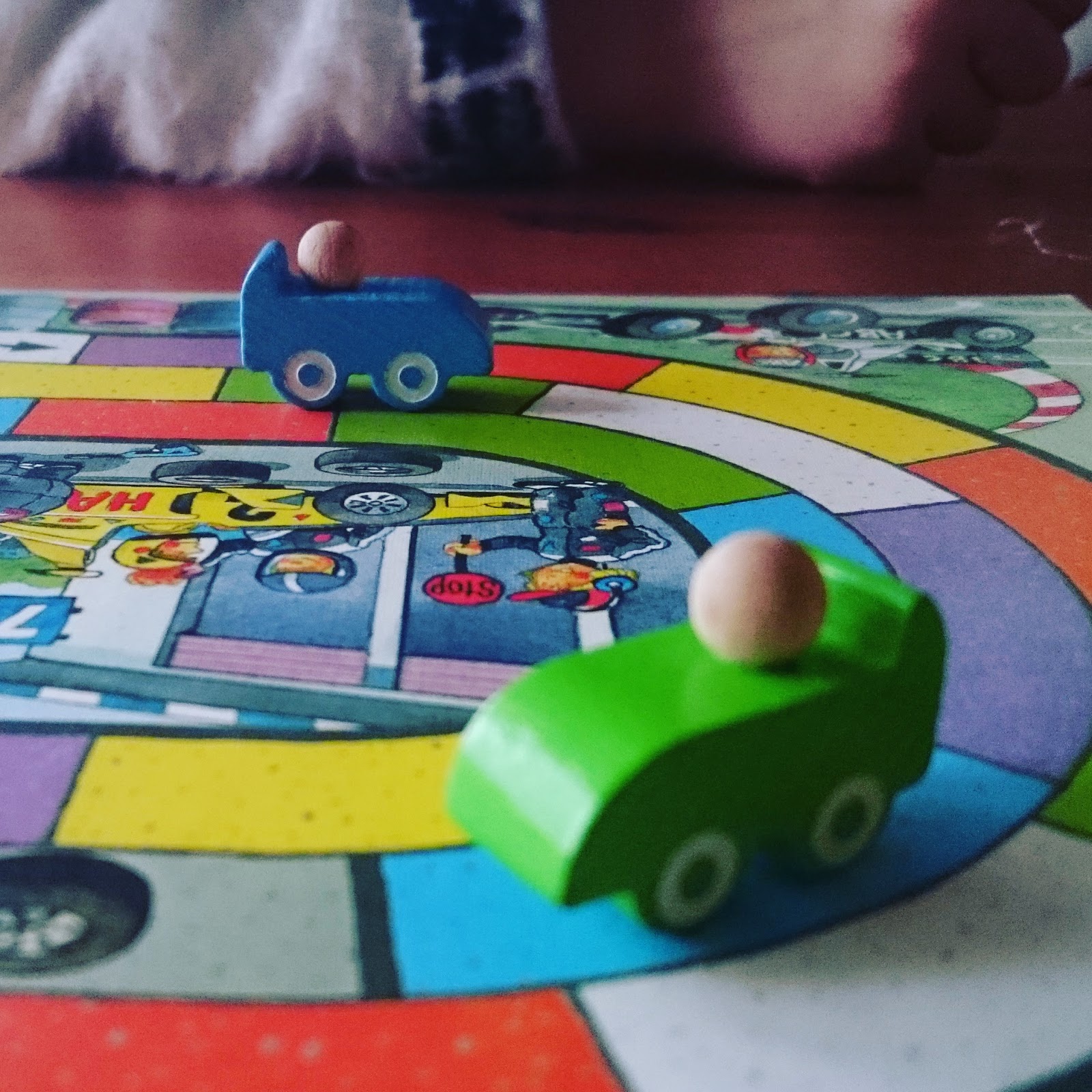 Players control cars racing around a colourful three-lane oval track using handfuls of colourful dice. The goal of the game is to, well, win the race. Each round a player throws 6 dice - each with the same six colours on its sides. Any dic result lets you move to an adjacent place on the board of that colour, as long as you move forward, forever forward. It's up to the player to chose the order in which their dice are spent. And that is where the game manages to introduce basic concepts of tactics. Rare stuff in a game for 5 year olds, but it works well here.