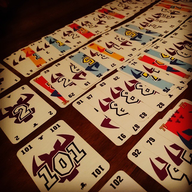 | The Game played with cards from "6 nimmt!". (The contents of the piles of cards should normally not be visible, methinks.) |